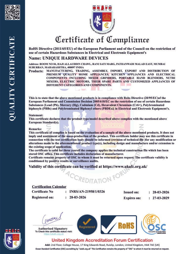 At Wildan, we are committed to delivering premium-quality kitchen appliances that comply with RoHS (Restriction of Hazardous Substances) certification, a globally recognized standard ensuring the restriction of harmful materials in electrical and electronic products. This certification reflects our dedication to environmentally responsible manufacturing, product safety, and sustainable practices while maintaining superior performance and reliability.